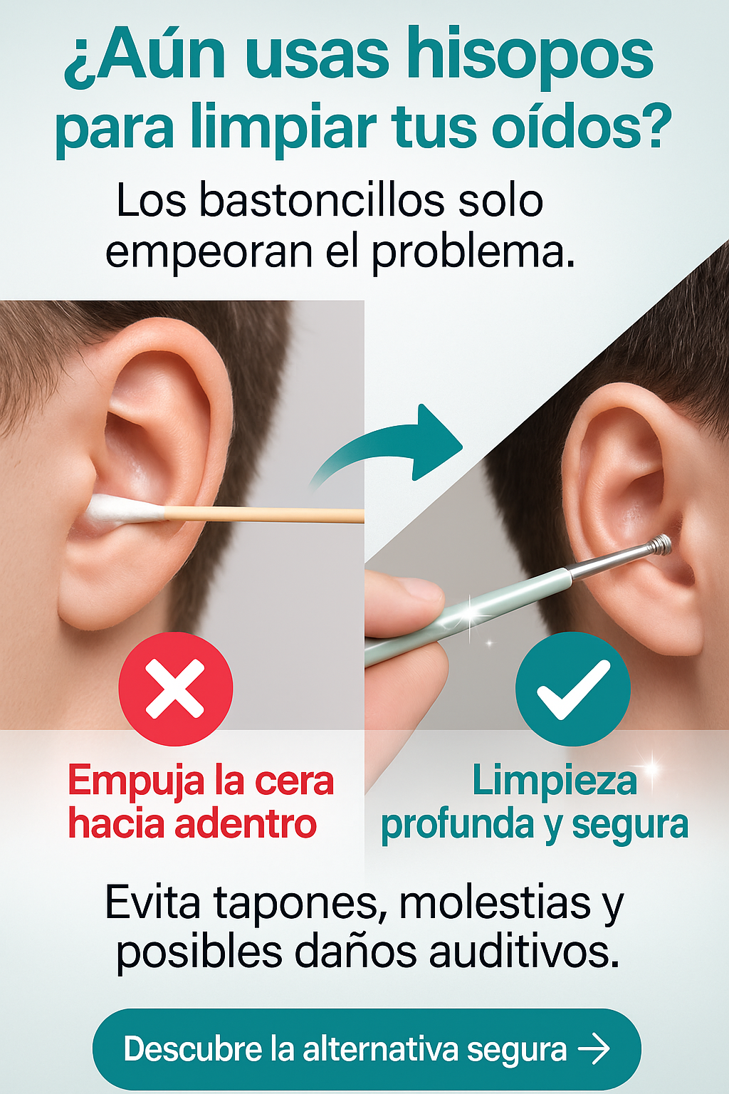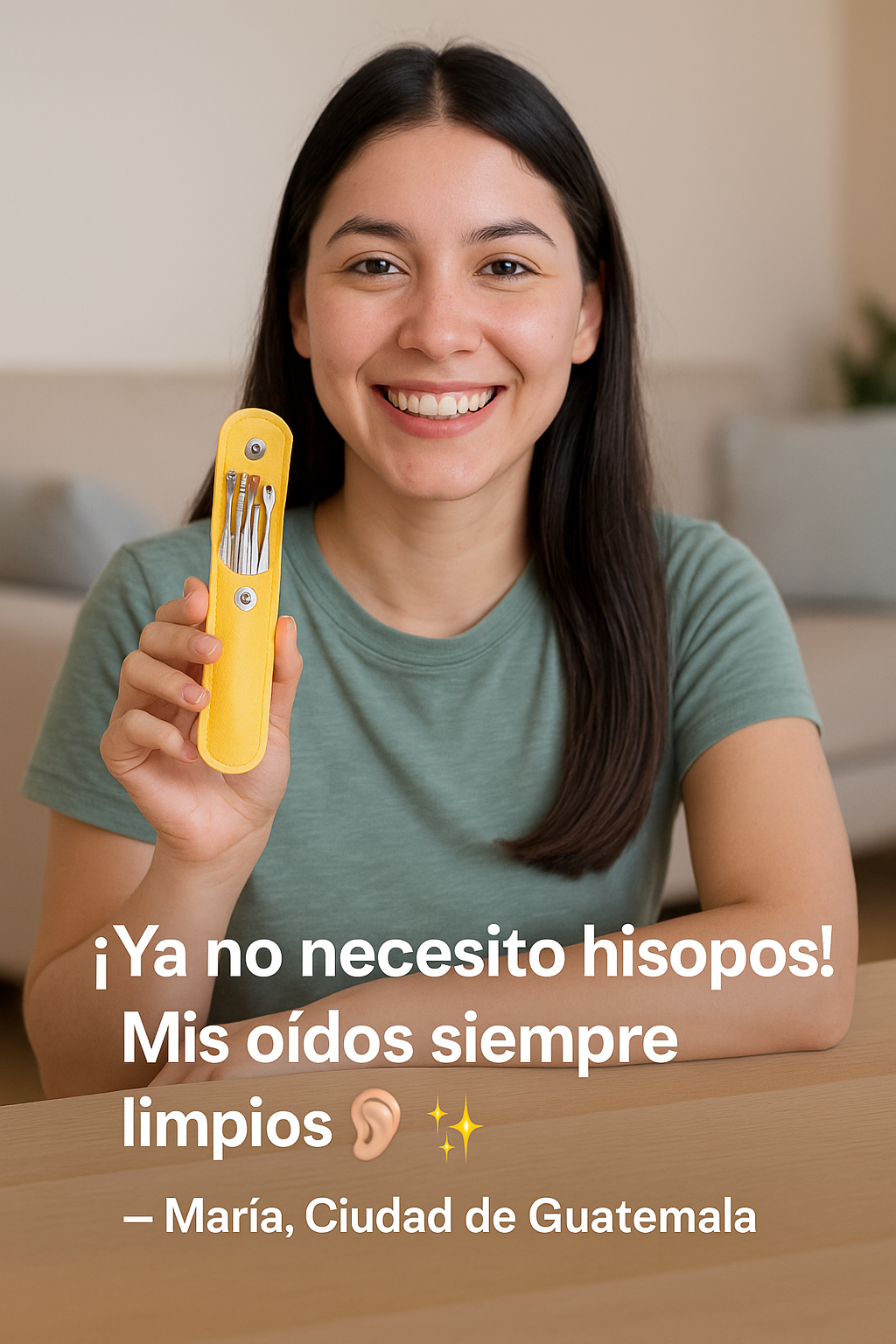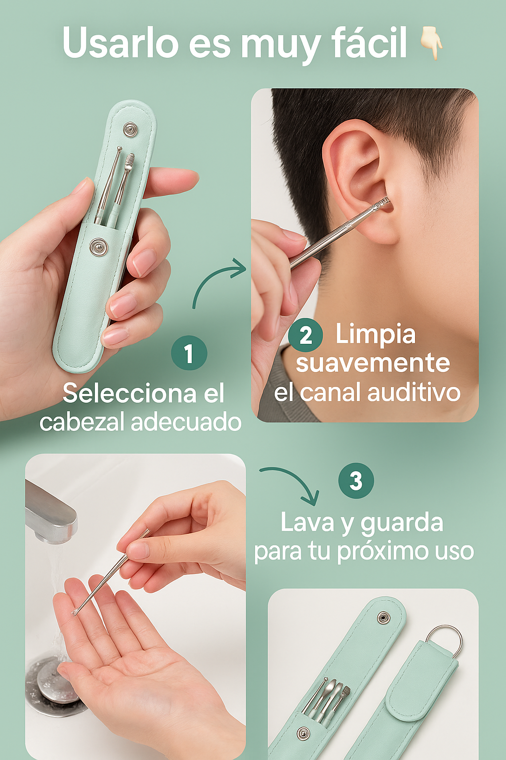 Sus puntas metálicas curvas y de resorte permiten limpiar sin empujar la cera hacia dentro, evitando molestias o infecciones.